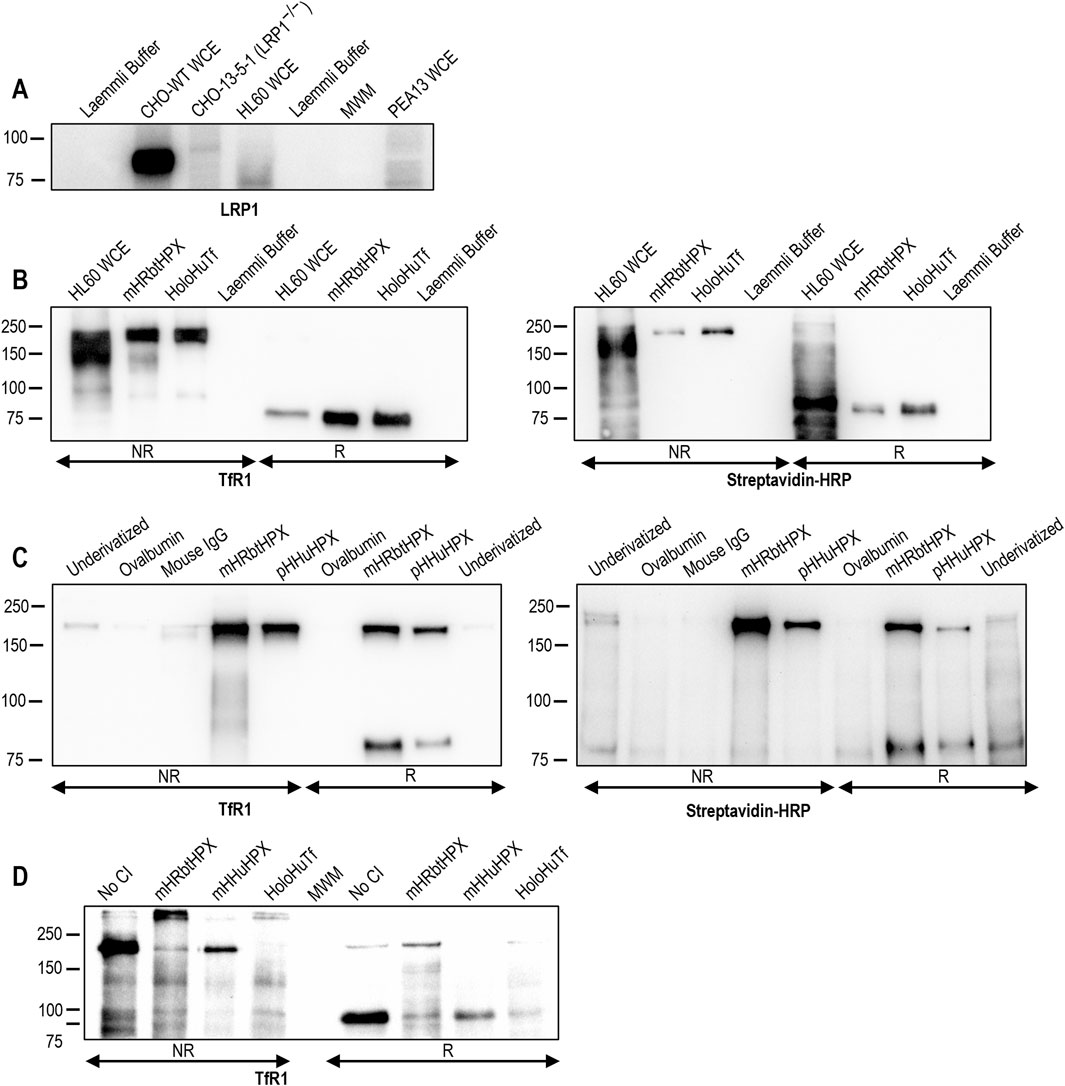 Figure 1. Affinity isolation of heme–HPX binding proteins from whole-cell extracts of LRP1−/−HL60 cells. (A) Western blotting reveals that HL-60 cells lack the small subunit of the scavenger receptor, LRP1, in contrast to wild-type (WT) CHO cells. Two additional LRP1 negative controls are the extracts of CHO-13-5-1 and human fibroblast PEA13 cells. (B, C) TfR1 is the protein bound to both mesoheme–rabbit HPX Affi-Gel (mHRbtHPX) and proto-heme–human HPX Affi-Gel 15 (pHHuHPX); furthermore, TfR1 is biotinylated, showing that it came from the cell surface of HL-60 cells (the concentration of the reducing agent was decreased to show both dimer and monomer of TfR1). Additional data are presented in Tables 1 and 2. (D) The binding specificity of the human TfR1 and heme–HPX interaction was confirmed by competitive inhibition of a mHRbtHPX Affi-Gel 15 with holoHuTf, as the positive control, or with both mHHuHPX and mHRbtHPX complexes. LRP1 (Mr ∼85 kDa), TfR1 homo-dimer (Mr ∼200–180 kDa), and TfR1 monomer (Mr ∼80 kDa).