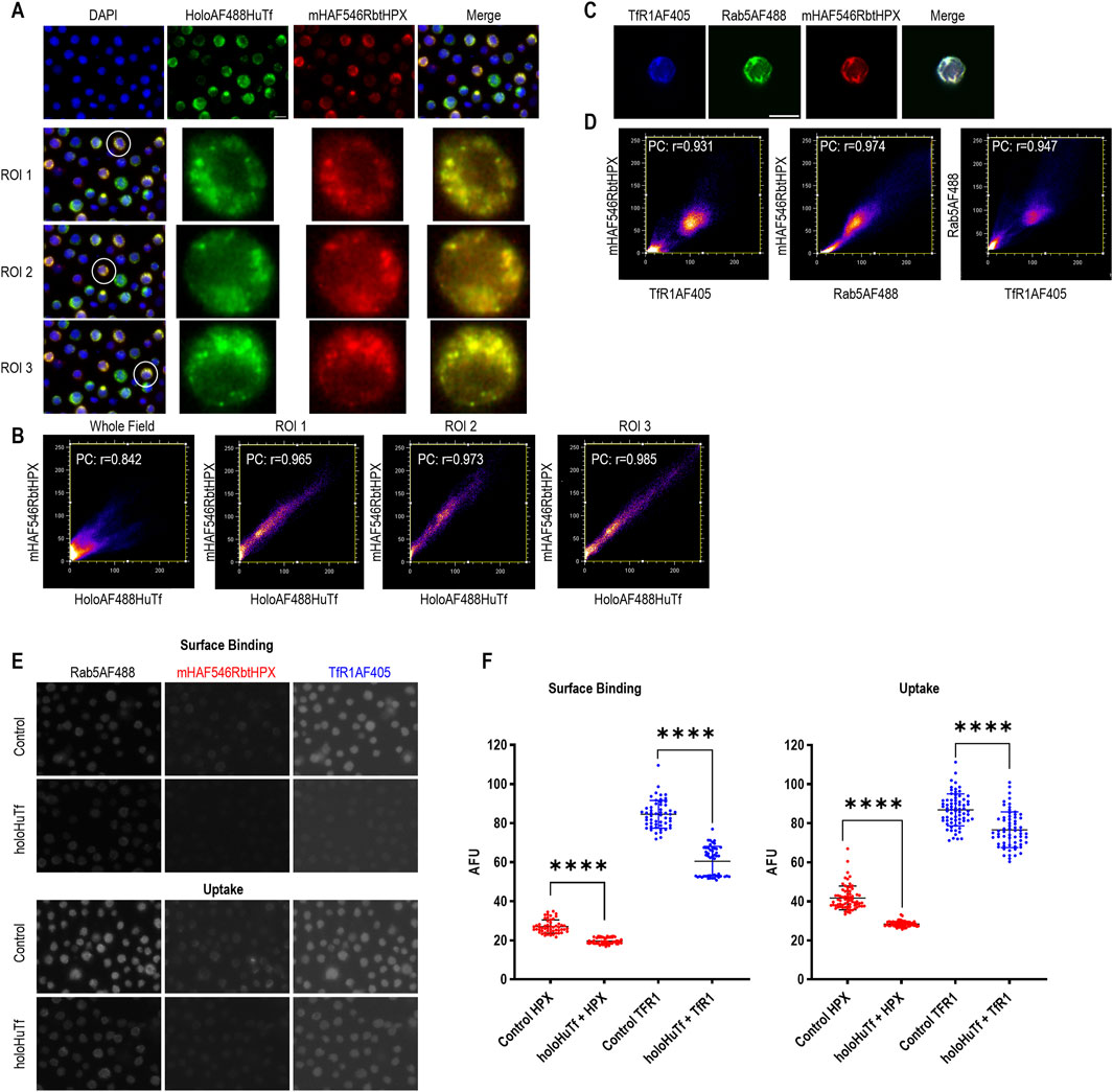 Figure 2. Evidence for trafficking of HPX with Tf and TfR1 support HPX internalization via the Tf endocytotic route in HL-60 cells. The data show co-localization within early Rab5-positive endosomes of HPX and Tf and HPX and TfR1. Significantly, the cell uptake of HPX is reduced after TfR1 downregulation in HL-60 cells, further supporting the involvement of TfRs in HPX endocytosis. (A) Co-localization of holoAF488HuTf (green color) with mHAF546RbtHPX (red color) after 10 min incubation at 37 °C. (C) Co-localization of TfR1AF405 (blue color) with mHAF546RbtHPX (red color) in early endosome marker Rab5AF488-positive (green color) endosomes. (B, D) Cytofluorograms of the whole field and regions of interest (ROIs) determine the overlay of Alexa Fluors and reveal positive Pearson coefficients (PCs). (E, F) Overnight incubation of HL-60 cells with 100 µM holo-human Tf significantly decreased TfR1AF405 (blue color) surface levels and uptake of mHAF546RbtHPX (red color). The early endosome marker Rab5AF488 was used as a mask to locate all the cells in the whole field. Thresholding methods were used to isolate pixels within these cells based on their higher intensity compared to background fluorescence. The results are presented as scatterplots, with error bars representing the mean ± SD of n = 54 HL-60 cells from three separate fields for surface binding and n = 74 HL-60 cells also from three separate fields for uptake, using Alexa Flour units (AFUs) on the y-axis. Significance is indicated as **** when p < 0.0001. Scale bar = 10 µm.