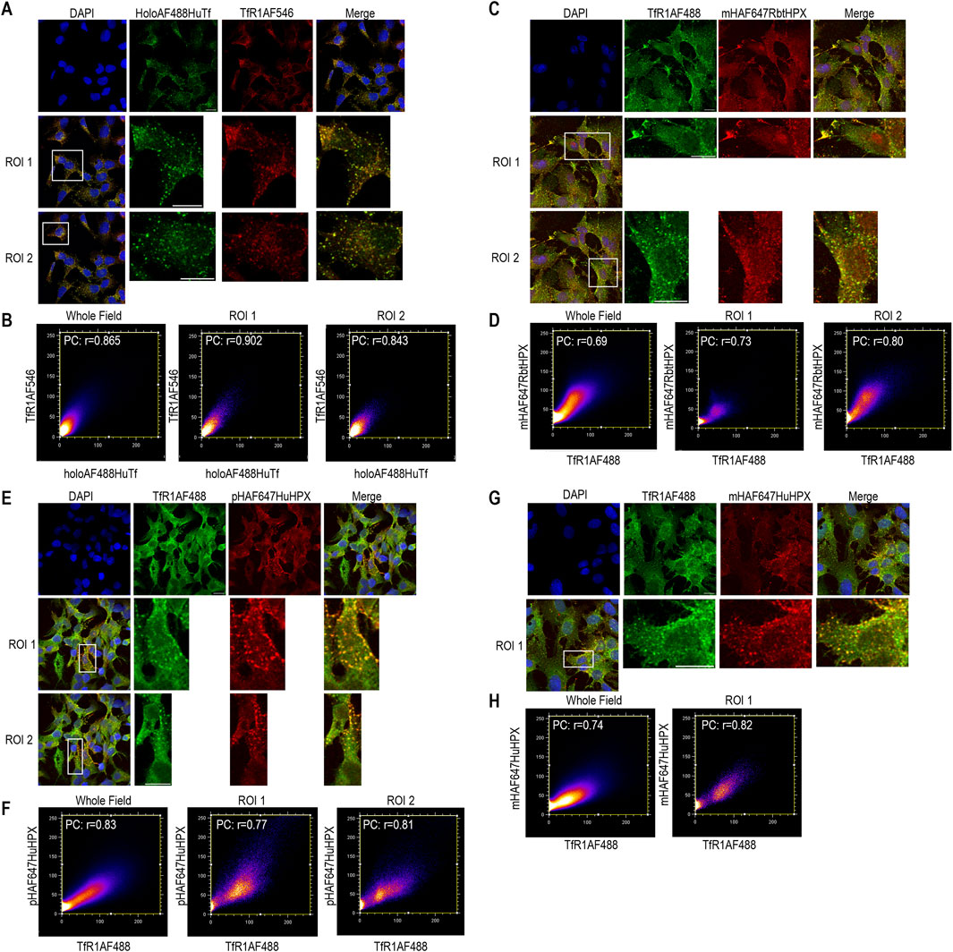Figure 3. In HepG2 cells, ICC data support the rapid co-localization of TfR1 with human or rabbit HPX after uptake of their heme complexes as with the positive control ligand, holo-human transferrin. Cells were incubated with one of heme–HPX complexes for 10 min at 37 °C. TfR1 was identified using Alexa Fluor-labeled antibody as described in the Methods. (A) Co-localization holoAF488HuTf (green color) and TfR1AF546 (red color) after 10 min incubation at 37 °C as a positive control. (C) Co-localization of TfR1AF488 (green color) and mHAF647RbtHPX (red color) after 10 min incubation at 37 °C. (E) Co-localization of TfR1AF488 (green color) and pHAF647HuHPX (red color) after 10 min incubation at 37 °C. (G) Co-localization TfR1AF488 (green color) and mHAF647HuHPX (red color) after 10 min incubation at 37 °C. (B, D, F, H) Cytofluorograms of the whole field and ROIs that reveal a positive PC. HepG2 scale bar = 15 µm.