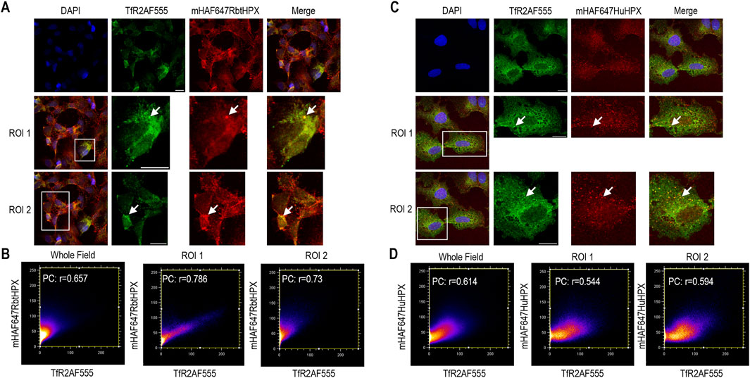Figure 5. In HepG2 cells, heme complexes of both rabbit and human HPX are taken up and co-localize with TfR2, consistent with liver targeting of heme–HPX in vivo. (A) Co-localization of mesoheme–rabbit HPX (mHAF647RbtHPX, red color) with TfR2AF555 (green color) after 10 min of incubation of heme–HPX complexes with the HepG2 cells at 37 °C. (C) Co-localization of TfR2AF555 (green color) and mesoheme–human HPX (mHAF647HuHPX, red color) under the same conditions of incubation of heme–HPX complexes with the HepG2 cells. (B, D) Cytofluorograms of the whole field and regions of interest reveal a positive PC. The images were acquired using a high-performance 40×1.3 NA oil objective with a theoretical diffraction limit of ∼272 nm. Well-resolved features with strong co-localization, corresponding to the brightest and largest structures, are apparent in smaller punctate vesicles in several cells (see white arrows for examples). HepG2 scale bar = 15 µm.