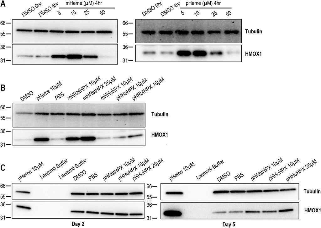 Figure 6. In HepG2 cells and primary human hepatocytes, HMOX1 induction requires heme, and its induction by heme–complexes of both rabbit and human HPX supports the uptake of heme–HPX for heme delivery to these cells. (A, B) Western blotting confirms that mesoheme (mH), proto-heme (pH), and heme–HPX complexes induce HMOX1 in HepG2 cells after 4 h of incubation at 37 °C. (C) On day 5 of culture, freshly plated human hepatocytes respond to heme–HPX complexes by inducing the HMOX1 protein. Data shown are representative of primary hepatocytes from liver donor A (see Supplementary Figure S2 for donor information); however, HMOX1 induction was apparent in hepatocytes isolated from three individual liver donors (data not shown).