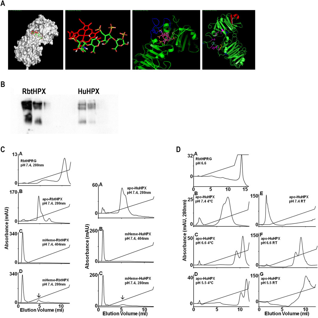 Purified HPX (100 μL at 2 mg/mL) was chromatographed on a 1 mL HiTrap Heparin HP Column (GE Healthcare) at a flow rate of 0.5 mL/min on an AKTA Purifier 100 controlled with UNICORN 5.0 software. For additional experimental details, please refer to Supplementary Material. A known heparin binding protein, histidine proline-rich glycoprotein (HPRG), isolated from rabbit plasma, was used as a positive control (Lijnen et al., 1983; Borza and Morgan, 1998). To cover a range of biologically relevant pH, buffers used were 10 mM NaPO4 pH 7.4, 10 mM NaPO4 pH 6.6, and 10 mM MES pH 5.5. Apo- and mesoheme–rabbit HPX (∼90%) or proto-heme–human HPX complexes (33.9 mM and 38.3 mM, respectively) were investigated. The Emm for HPRG was OD280 0.53 = 1 mg/mL, and for hemopexin was OD280 1.93 = 1 mg/mL. The protein elution profiles were recorded using OD280 for apo-HPX and for the heme complex, both OD280 and OD404. After sample protein injection, 2 column volumes (CV) of 10 mM sodium phosphate buffer, pH 7.4, were used to elute unbound material, followed by 10 CV of a gradient to 50% buffer containing 2 M NaCl (i.e., a gradient from 0 M to 1 M NaCl). The initial conductivity of all buffers ranged from 0.25 to 1.9 mS/cm).