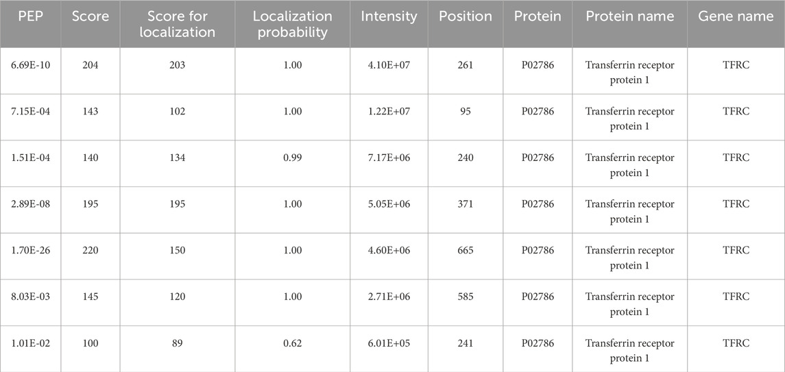 Table 1. Analysis and quantification by mass spectrometry of peptides identifying biotinylated transferrin receptor 1 (TfR1) isolated from the cell surface of biotinylated HL-60 cells from whole-cell extracts. Peptide identification scores and metrics were identified from the MaxQuant “Peptide” text output file. The complete dataset of biotinylated peptides from which these are derived is shown in Supplementary Table S1. Peptides were assigned to TfR1 comes based on localization probability, which is generally considered “good” at a value of ∼0.75 or higher.