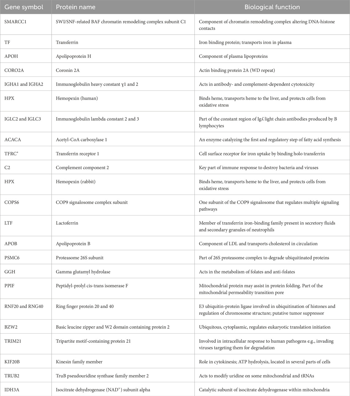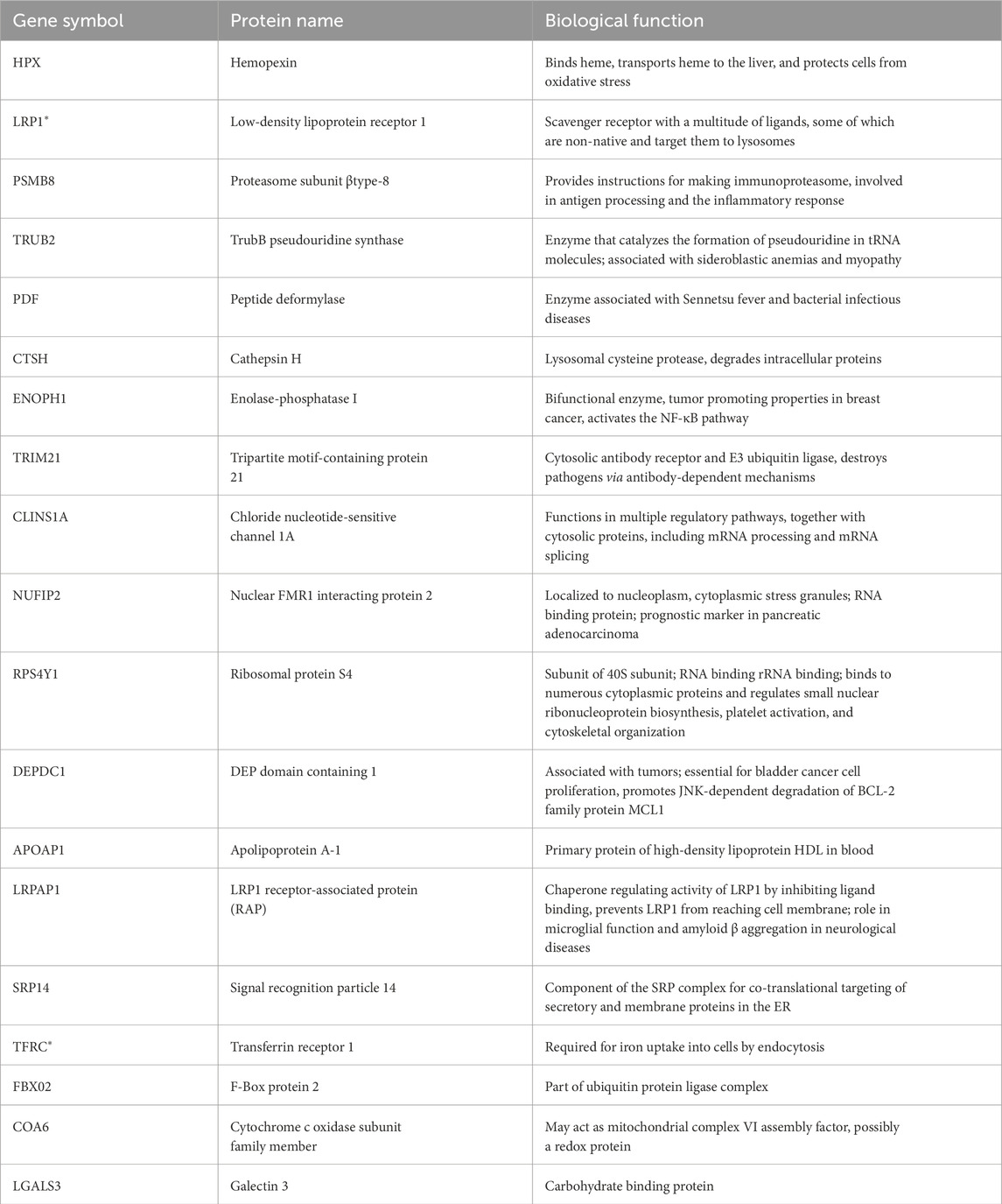 The well controlled heme-HPX affinity chromatography of cell extracts containing biotinylated surface proteins from undifferentiated human HL-60 cells, together with an unbiased analysis using LC-MS/MS, revealed some additional members of the HL-60 HPX “interactome,” providing novel and unique information on the HPX system in immune cells (Supplementary Table S1). As anticipated, TfR1 was the top target consistently and was shown to be derived from the cell surface of LRP1−/−HL-60 cells.