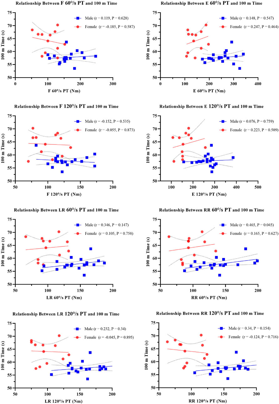 Figure 2. Scatterplots of Trunk Strength versus 100 m Performance PT, Peak Torque; F, flexor; E, extensor; LF, left rotation; RR, right rotation. All correlations non-significant after FDR correction (q < 0.05).