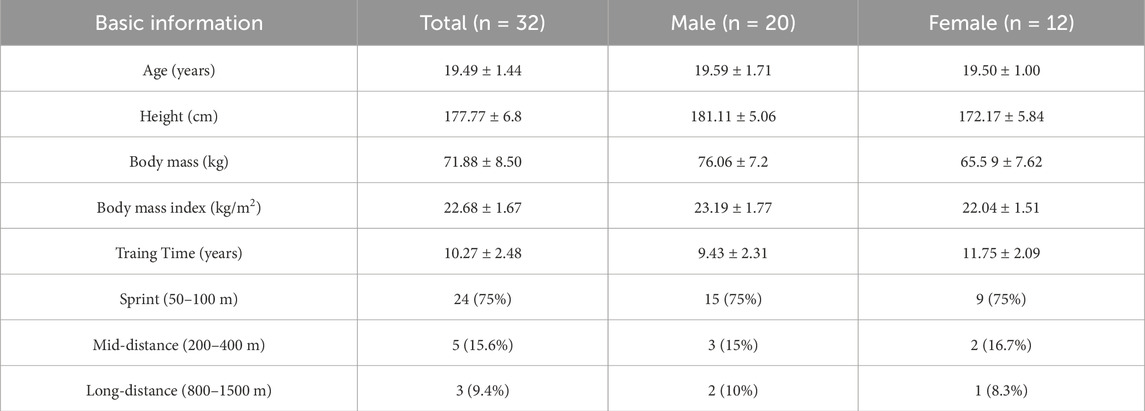 Thirty-two elite swimmers (age: 19.49 ± 1.44 years; height: 177.77 ± 6.84 cm; body mass: 71.88 ± 8.50 kg; body mass index: 22.68 ± 1.67 kg/m2), including 9 national-level athletes, were recruited for this study after meeting the criteria of being at a Chinese first-class level or higher. The basic information differences existed between sexes as detailed in Table 1. All participants confirmed their lack of significant injuries in the preceding 6 months and provided written informed consent after a comprehensive explanation of the study’s aims and methods. Swimmers usually perform 3-4 swim drills per week and at least 2 structured strength and conditioning sessions per week during the testing cycle. All subjects provided written informed consent and their personal information was handled anonymously. The research protocol was approved by the Ethics Committee of Beijing Sport University.