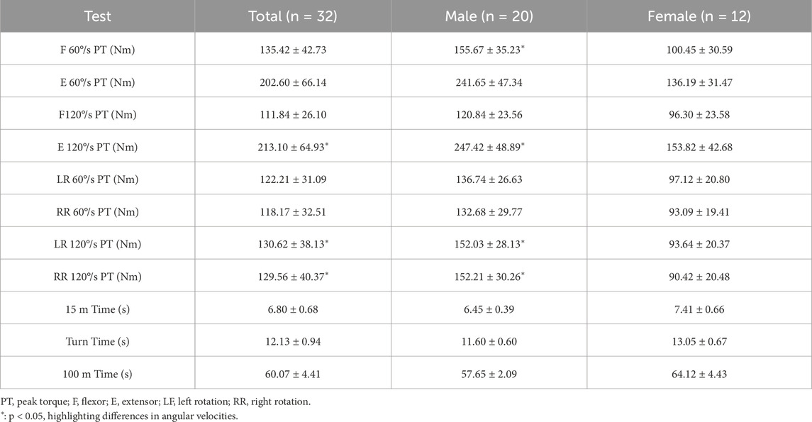 The data presented in Table 2 indicate significant sex-based differences in peak torque (PT) for trunk extension and rotation. Trunk extension PT was significantly greater than flexion PT at both high and low angular velocities (p < 0.01). Although left rotation PT was marginally higher than right rotation PT, this difference was not statistically significant. High-speed conditions elicited greater PT in trunk extension and rotation compared to low-speed conditions (p < 0.05).