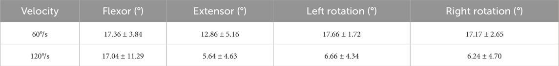 Table 3 displays the peak torque angle distribution of the trunk, showing that peak torque consistently occurs at mid-range angles across all movements, with minimal variability at 60°/s. Notably, there is a significant angle reduction in extensors and rotators at 120°/s, while the flexor angle remains stable but with high standard deviations.