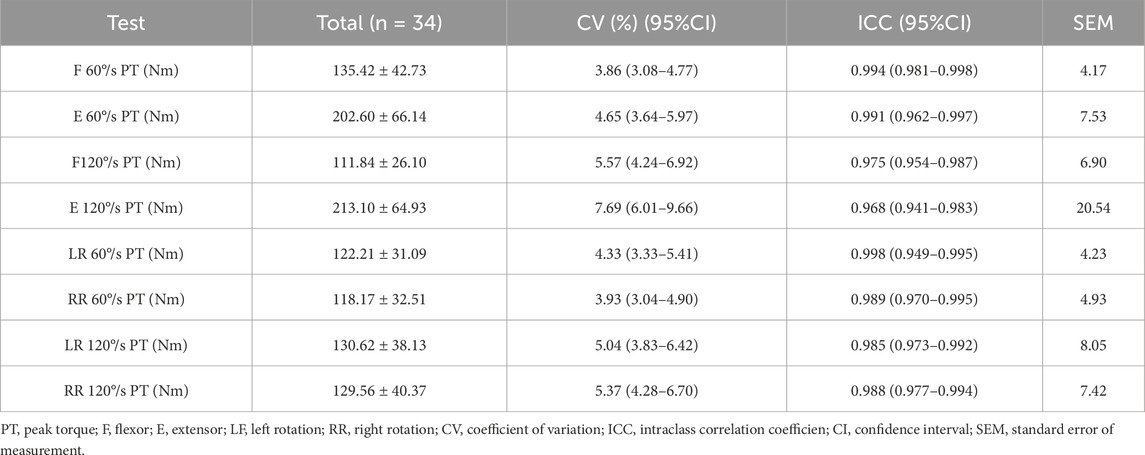 Participants were instructed to cross their arms over their chest and exert maximum effort from the start of the first set until the test concluded. Verbal encouragement was provided to ensure maximal effort was sustained throughout testing. Before assessment, participants completed a standardized 15-min warm-up protocol comprising dynamic stretching, core activation exercises, pillar preparation drills, and medicine ball throws. To acclimate to the protocol, participants completed three maximal isokinetic practice contractions followed by ten consecutive maximal efforts. This warm-up facilitated familiarity with the equipment and test procedure. The total testing duration ranged from 60 to 80 min. To accurately assess reliability, each participant underwent five testing sessions of the isokinetic trunk flexion-extension protocol. All trials were conducted at the same time of day and overseen by the same researcher. During the initial testing session, each participant’s position on the dynamometer was logged and consistently controlled across all sets and sessions by adjusting pads and straps to ensure protocol reliability. Peak torque (PT), the maximal moment generated during joint movement, was the primary outcome measure. Testing procedures followed manufacturer guidelines rigorously, administered by certified technicians. Participants received verbal encouragement to exert maximal effort throughout.