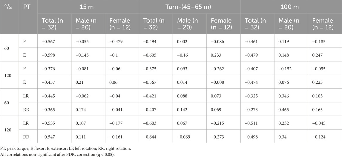 Table 5 presents correlation coefficients between trunk strength and swimming performance segments. Combined sample correlations are provided for reference only and may be confounded by sex differences. After Benjamini–Hochberg FDR correction (q < 0.05), no significant correlations were identified. In male swimmers, trunk strength generally exhibited non-significant or positive correlations with performance metrics showed mixed correlation directions (e.g., 60°/sF-15 m: r = −0.055; 120°/sE-15 m: r = 0.21). The strongest association was 60°/sRR-100 m (r = 0.465, p = 0.045), but it did not survive FDR correction. In female swimmers, trunk strength metrics did not show any statistically significant correlations with performance segments. However, early-phase performance (15 m) exhibited moderate negative trends with flexion torque: at 60°/s flexion (r = −0.479) and 120°/s left rotation (r = −0.177), in contrast to the positive correlations observed in males.
