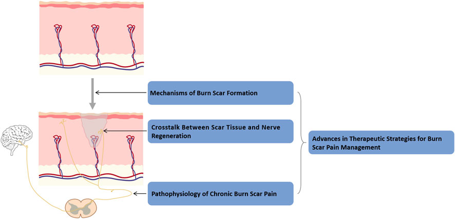To guide readers through the organization of this review, we have provided a roadmap in Figure 1, which outlines the four main themes: Mechanisms of burn scar formation; Crosstalk between scar tissue and nerve regeneration; Pathophysiology of chronic burn scar pain; and Advances in therapeutic strategies for burn scar pain management. The following sections will address each of these topics in turn.