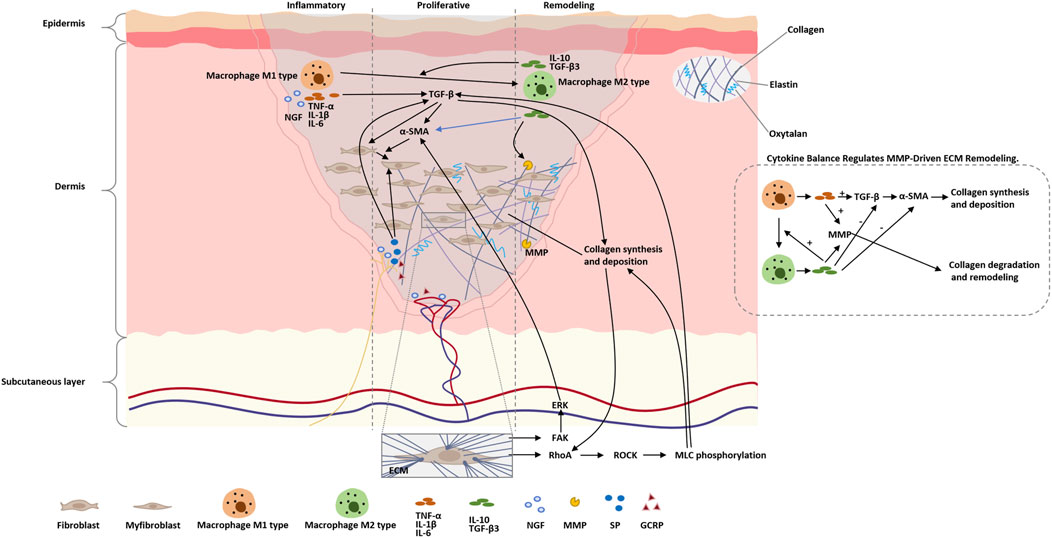 In the early stages of wound healing, pro-inflammatory M1 macrophages release high levels of cytokines such as tumor necrosis factor-α (TNF-α), interleukin-1β (IL-1β), and interleukin-6 (IL-6), which promote fibroblast proliferation, angiogenesis, and keratinocyte migration, yet also lay the groundwork for excessive fibrosis (Krzyszczyk et al., 2018). These cytokines stimulate fibroblast proliferation and collagen secretion and act synergistically with angiogenic factors like VEGF to facilitate neovascularization. Moreover, they modulate basement membrane components and chemotactic signals, enhancing keratinocyte migration and accelerating re-epithelialization. IL-6, in cooperation with VEGF, sustains endothelial cell proliferation and migration, thereby maintaining pathological angiogenesis that supports prolonged fibroblast activity and continuous collagen deposition (Johnson et al., 2020).