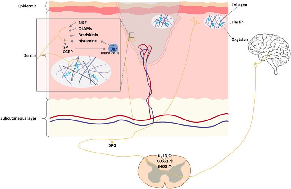 Sensory neurons in the scar release SP and CGRP, triggering mast cell degranulation and release of histamine, proteases, and cytokines. This neurogenic inflammation sensitizes nociceptors and recruits additional immune cells, creating a self-sustaining inflammatory loop at the scar site (Abd-Elsayed et al., 2022; Lee et al., 2022).