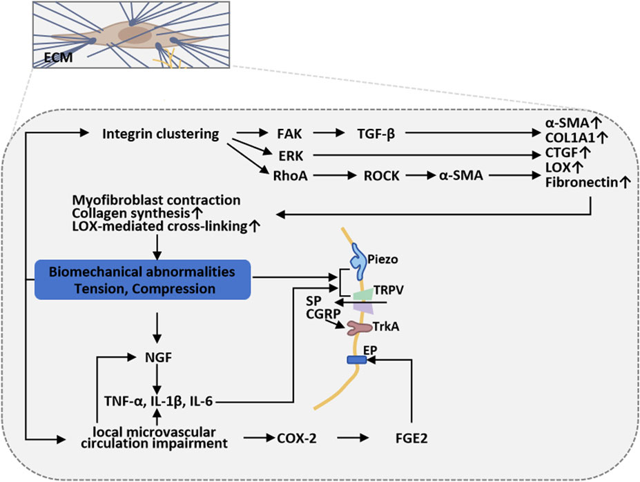 Biomechanical alterations of burn scars drive and sustain chronic pain through multilevel interactions (Morgan et al., 2018; Figure 4). In the course of burn wound remodeling, fibroblasts undergo phenotypic transition into myofibroblasts, leading to overproduction of densely cross-linked collagen. This excessive matrix cross-linking substantially augments scar stiffness and tissue adhesiveness, imposing continuous localized mechanical loads during skin traction or bodily movement, thereby activating peripheral nociceptors (Yin et al., 2022). The resultant mechanical milieu further drives fibrosis through canonical mechanotransduction cascades—integrin/focal adhesion-FAK, Rho/ROCK, and FAK/ERK—promoting sustained myofibroblast contractility and augmented matrix deposition. These processes reinforce each other to form a self-sustaining tension-fibrosis positive feedback loop (Yin et al., 2022). Furthermore, mechanical stimuli activate mechanosensitive ion channels—including the Piezo family and selected TRP channels—on peripheral sensory neurons and other cells, inducing neuronal depolarization and mechanical sensitization, which in turn amplify mechanical pain perception (He et al., 2021). Abnormal patterns of nerve regeneration are frequently observed within scar tissue, characterized by excessive proliferation and misdirected growth of nerve fibers, or entrapment within the fibrotic extracellular matrix, resulting in neuroma formation or small-fiber dysfunction. These alterations are accompanied by upregulation of neurotrophic factors such as NGF, SP, and CGRP, as well as neuroinflammatory mediators, which collectively exacerbate aberrant peripheral discharges and sustain neuropathic pain (Yang et al., 2025). In parallel, impaired microcirculation and focal hypoxia within the scar maintain a state of low-grade chronic inflammation. Repetitive and intense peripheral inputs may, via spinal and supraspinal pathways, induce or aggravate central sensitization, thereby establishing a chronic pain state driven by peripheral–central interplay (Yang et al., 2025).
