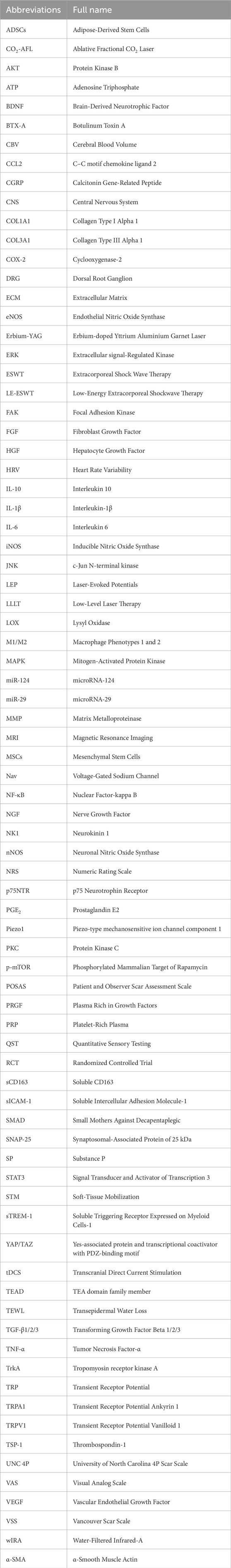 Despite the availability of various analgesic and anti-scar interventions—such as pressure therapy, silicone dressings, laser treatments, and pharmacological approaches—the efficacy of these methods remains limited due to significant inter-individual variability and the lack of precise therapeutic targets. As a result, current strategies often fail to meet the diverse needs of burn patients. Therefore, elucidating the mechanisms underlying the interaction between scar formation and pain perception, identifying novel therapeutic targets, and developing multidimensional objective assessment tools are of critical importance for optimizing personalized treatment strategies (Faour et al., 2023). This review will explore the molecular and cellular mechanisms, neuropathological pathways, and the interplay between scar tissue and nerve regeneration. By integrating the latest research advances, we aim to identify potential translational points between mechanistic understanding and clinical application, thereby providing a theoretical foundation and research framework for future precision therapies. See Table 1 for a full list of abbreviations used.