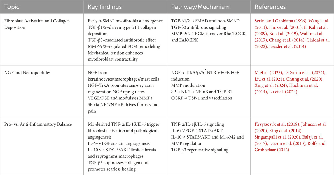 Burn scar formation is a highly dynamic and multi-layered process that begins with an acute inflammatory response at the site of injury, followed by a proliferative phase, and culminates in a remodeling phase where relatively stable scar tissue is formed (Werner and Grose, 2003). During this progression, fibroblasts transdifferentiate into myofibroblasts under the combined influence of transforming growth factor-β (TGF-β) signaling and mechanical tension (Tomasek et al., 2002), producing excessive type I and III collagen that contributes to the development of a fibrotic extracellular matrix (Wynn, 2008). Nerve growth factor (NGF) and neuropeptides such as Substance P (SP) and calcitonin gene-related peptide (CGRP) not only facilitate nerve and vascular remodeling but also modulate pain sensitivity within scar regions (Ji et al., 2014). The balance between early pro-inflammatory cytokines (e.g., TNF-α, IL-1β, IL-6) and later anti-inflammatory mediators (e.g., IL-10, TGF-β3) plays a critical role in regulating the activity of matrix metalloproteinases (MMPs), which in turn governs collagen degradation and remodeling efficiency—ultimately influencing the texture and functional quality of the resulting scar tissue (Page-McCaw et al., 2007). Figure 2 illustrates the main cellular and molecular mechanisms of the burn scar formation process. Table 2 summarizes the major cellular and molecular pathways involved in burn scar formation and pain modulation.