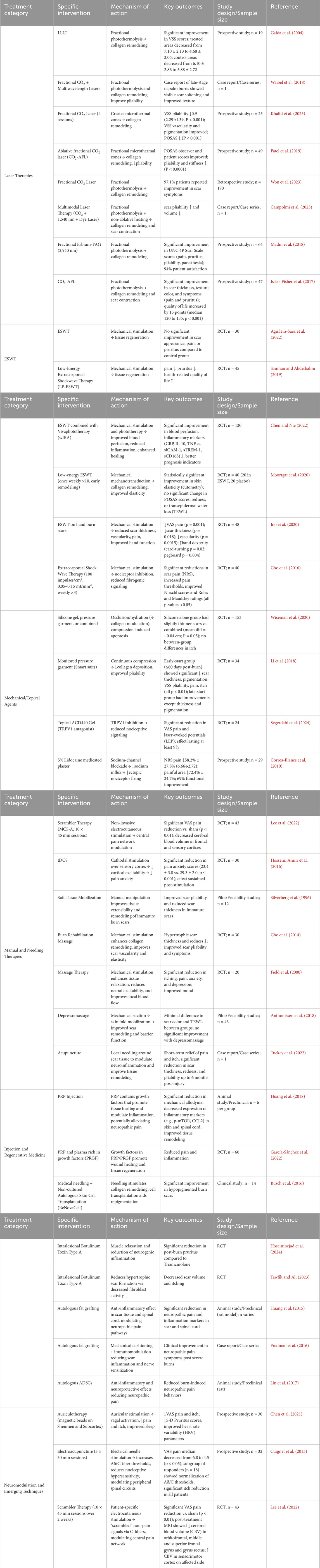 Burn-scar pain therapies have evolved from single-modality palliation to multimodal, mechanism-based regimens addressing fibrosis, aberrant innervation, and neuroinflammation. These approaches fall into six interrelated categories—laser therapies, ESWT, mechanical supports/topicals, manual and needling therapies, injection/regenerative medicine, and neuromodulation—converge on collagen remodeling, inflammation modulation, and nociceptor desensitization. To provide a clearer overview of current interventions targeting burn scar pain, Table 3 summarizes key treatment categories, specific interventions, mechanisms of action, clinical outcomes, and supporting evidence.