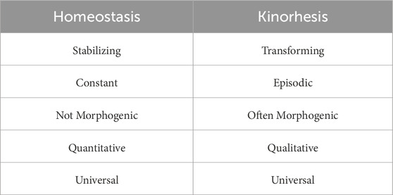 Although maintenance of stability is necessary for life, stability is not sufficient to explain all of physiology over the course of an individual’s life history. Various transformative events and processes are controlled by physiology and are necessary elements of a life history. Transformative processes in physiology are associated with growth, development, and reproduction. Evolution has provided organisms with homeostatic processes that provide stability for living in the now, and transformative (kinorhetic) processes that propel changes for growth, development, and reproduction so as to live and perpetuate into an uncertain future. Table 1 summarizes comparisons that explain the basic contrasts between the physiology involved in kinorhesis and homeostasis.