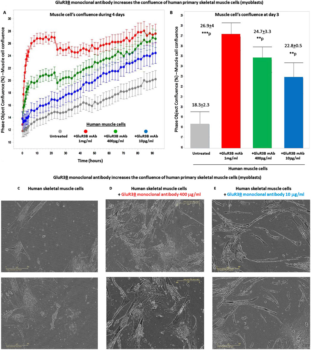 Figure 3. GluR3B monoclonal antibody increases the number of human primary skeletal muscle cells growing in tissue culture. Mouse GluR3B mAb at six different concentrations: 1, 10, 25, 100, 400, or 1,000 μg/mL in PBS, or control PBS only, was added to human primary skeletal muscle cells (myoblasts) growing in the tissue culture. The cells were monitored and photographed using the IncuCyte system (as described in the Results and Materials and Methods). After 1 week, the cells were counted by flow cytometry. Each experimental group consisted of six replicate wells (n = 6). The figure shows the average numbers and the standard deviation (SD) of the muscle cell number in each experimental group and the statistical values calculated by T. test. The p values show that the effect of the GluR3B mAb were statistically significant when added at a conc. of either 10, 25, 100, 400, or 1,000 μg/mL. The statistical analysis comparing GluR3B mAb-treated muscle cells to untreated cells yielded the following p values: GluR3B mAb 1 μg/mL - p = 0.13 - ns; 10 μg/mL - *p = 0.02; 25 μg/mL - *p = 0.06 - ns; 100 μg/mL - **p = 0.006; 400 μg/mL - *p = 0.02; 1,000 μg/mL (=1 mg/mL) - ***p = 0.001. ns = not significant.