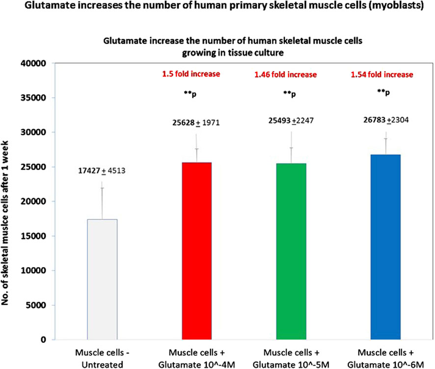 The second novel finding of this study is that glutamate by itself (i.e., in the absence of any other neurotransmitter or other stimuli/factor) activates human skeletal muscle cells (myoblasts), leading to functional effects. This tentative conclusion is based on the three glutamate-induced effects found in the present study (out of all possible effects that glutamate may induce and not studied yet): 1. Glutamate increased the level of intracellular sodium ions in skeletal muscle cells, lasting for many hours afterwards, 2. Glutamate increased the number of skeletal muscle cells (counted few days later), most probably by inducing cell proliferation, 3. Glutamate increased the skeletal muscle cells’ confluency.