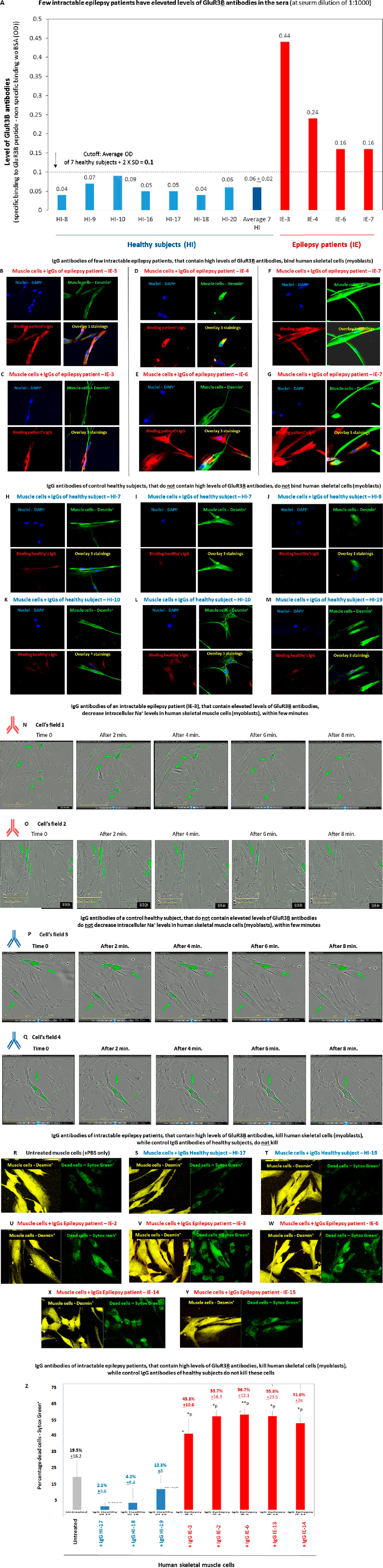 In the last set of experiments in this study, we found that IgGs of few intractable epilepsy patients which have elevated GluR3B antibodies not only bind human skeletal muscle cells, but also kill some of these cells within 1 h only (Figures 10U–W). In contrast, IgG antibodies of healthy subjects do not induce cell death (Figures 10S,T).