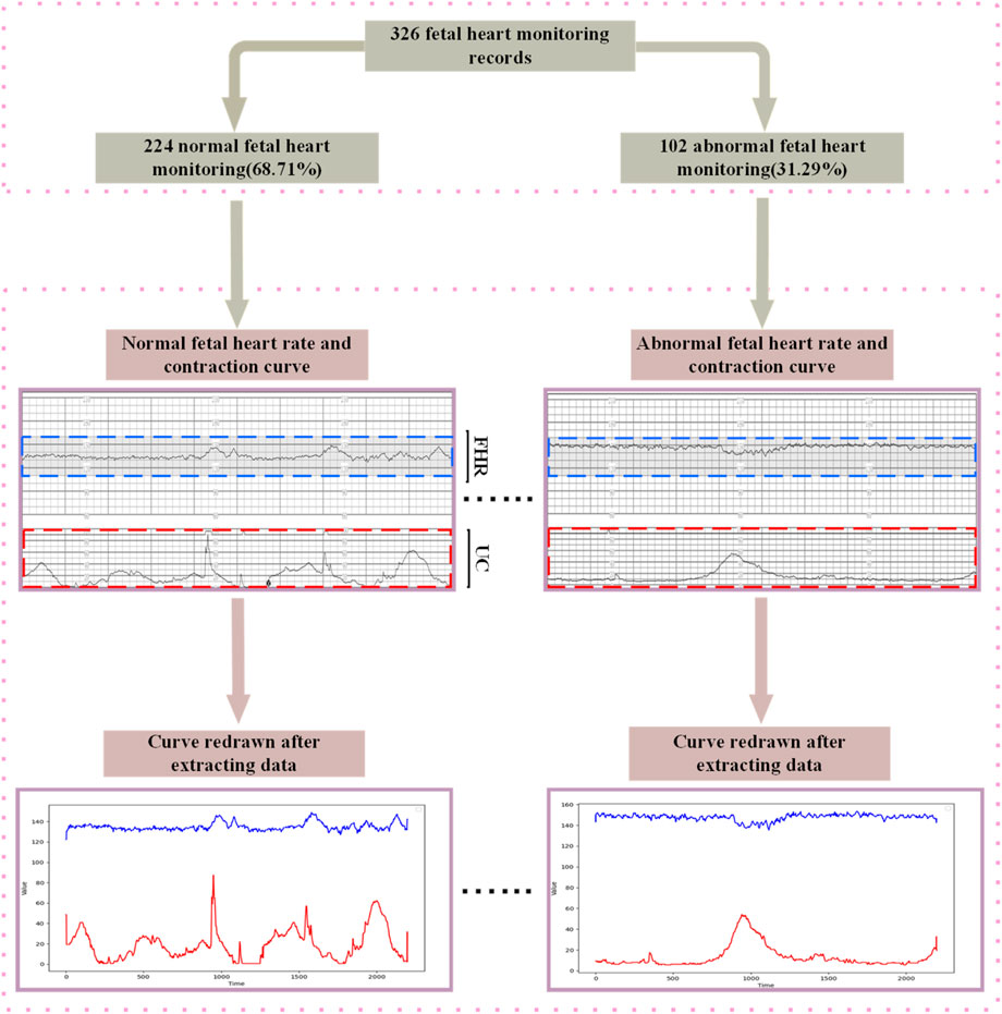 Although the above methods through machine learning or deep learning have achieved more or less good results, researchers are not uniform in the standard of the data, for example, some people artificially introduce features to let the model learn, or use a one-dimensional array of fetal heart rate as the input of the model to learn, but usually doctors use the intuitive graph of the change curves of the fetal heart rate and the contraction rate to interpret. Therefore, in this study, in order to minimize the criteria for distinguishing normal and abnormal fetal heart rate, we innovatively use images as the dataset, which contain two curves of fetal heart rate and contraction rate, in order to be closer to the needs of clinical practice.