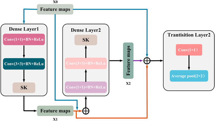 This connection makes the features fully reused and fused between different layers, enhances the feature transfer efficiency, and the gradient can be transferred more efficiently in the backpropagation process. Figure 7 shows a DenseBlock containing 2 DenseLayers, the