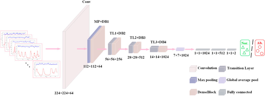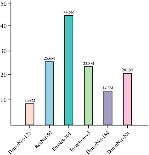 This structural design allows the network to converge faster during the training process and reduces the occurrence of the gradient vanishing problem. At the same time, it is also characterized by high parameter efficiency; compared with other convolutional neural networks of the same type, DenseNet121 has fewer parameters at the same performance level (He et al., 2016; Szegedy et al., 2016), which is only 7.98M, as shown in Figure 8. In addition, there is a transition layer in the middle of every two Dense Block blocks, which contains 1 × 1 convolution with average pooling, actively reduces the feature map dimension through channel compression, and compression suppresses overfitting and enhances noise robustness. The DenseNet121 network structure is shown in Figure 9.