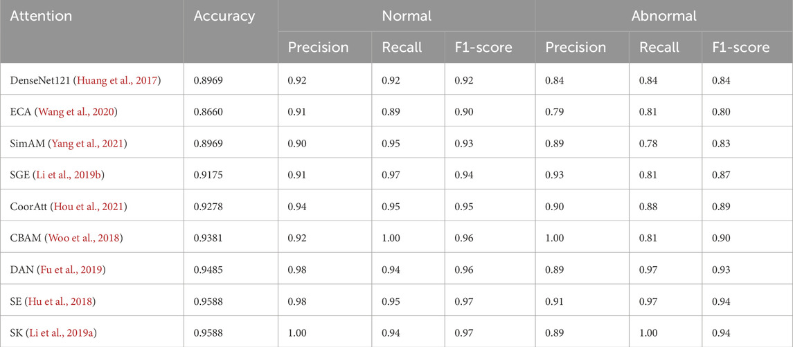 Table 2 compares the side-by-side comparisons using the DenseNet121 backbone network and fusion of eight mainstream attention mechanisms, in which SK achieves the optimal performance with an accuracy rate of 0.9588, which is tied for first place with classical SE attention, but demonstrates significant advantages in key clinical metrics: the normal samples achieve a 100% precision rate (Precision = 1.00), which effectively avoids the risk of misdiagnosing the normal The normal samples achieved 100% precision (Precision = 1.00), effectively avoiding the risk of misdiagnosing normal fetal heart as abnormal; the abnormal samples achieved 100% recall (Recall = 1.00), ensuring that all abnormal cases were effectively detected. In terms of the comprehensive assessment indexes, both the normal category F1-score (0.97) and the abnormal category F1-score (1.00) were significantly better than the comparison scheme, with an improvement of 5.0% and 16.0%, respectively, compared with the baseline method, and the confusion matrices are shown in Figure 11. The experimental results show that the SK module enhances the model’s hierarchical characterization of fetal heart fluctuation features through the strategy of dynamically selecting multi-scale convolutional kernels, and its channel attention mechanism precisely focuses on the pathology-related features, which results in a clearer decision boundary for the normal/abnormal category. This performance advantage is valuable in clinical scenarios to eliminate the waste of medical resources caused by false-positive diagnosis and avoid the medical risks caused by false-negative missed diagnosis.