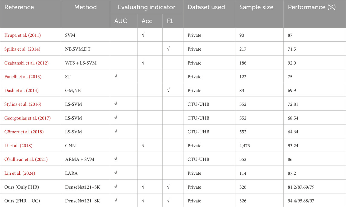 Table 3 summarize the results of the evaluation of existing methods for fetal heartbeat monitoring classification, covering the performance of different models in machine learning, deep learning on their respective datasets. It can be seen that this study achieved AUC: 94.4/Acc: 95.88/F1: 97 on the self-constructed bimodal dataset, whereas the performance of unimodal (FHR only) dropped to AUC 81.2/Acc 87.69/F1 0.79 under the same model structure, a result that validates the value of contraction signals as an auxiliary feature. The comparison results in Table 3 do not constitute a strict performance ranking, and there are limitations in directly comparing the performance of these methods due to the following reasons: first, the cited studies each used a different private or public dataset, with sample sizes ranging from 83 to 4,473 cases, and the difference in sample sizes may affect the assessment of the model’s generalization ability. Second, some of the methods were designed based on 1D fetal heart rate signals, whereas our DenseNet121-SK model deals with 2D images after bimodal signal conversion. Even if the reproduction on the same dataset is forced, the signal needs to be resampled, windowed, or spectrally transformed, which introduces additional preprocessing bias and leads to less rigorous performance comparisons. Therefore, the comparison results in Table 3 are more of a reference for method trends rather than a strict performance ranking.
