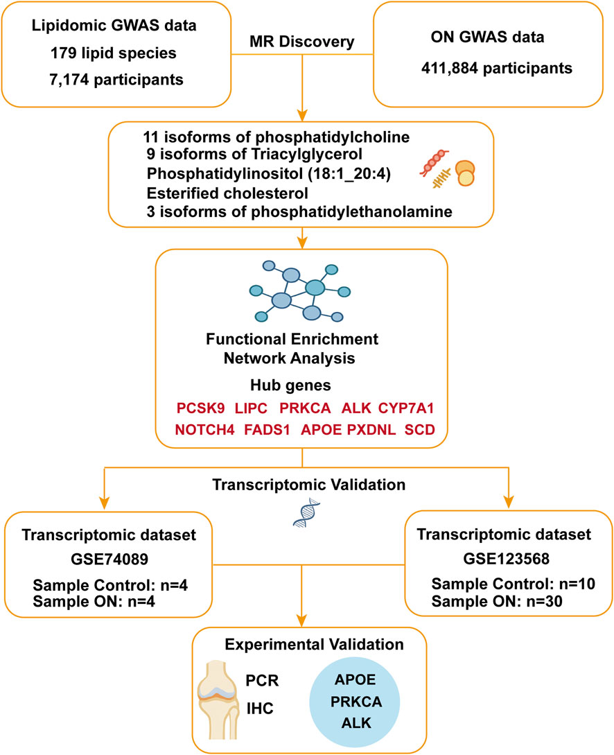 Mendelian randomization (MR), a genetic instrumental variable approach, offers a robust framework to infer causality by leveraging genetic variants as proxies for modifiable exposures (Yu et al., 2024; Yu et al., 2023). Unlike observational studies prone to confounding and reverse causation, MR minimizes these biases through the random allocation of alleles during gamete formation (Yan et al., 2022; Kabata et al., 2005). While prior MR studies have linked lipid traits to musculoskeletal disorders (Weinstein et al., 2000; Motta et al., 2022), no study has systematically evaluated the bidirectional causal relationships between detailed lipidomic profiles and ON. Furthermore, the molecular mechanisms underlying lipid-ON interactions, as well as the target genes involved (e.g., oxidative stress, osteoblast dysfunction, or vascular impairment), remain speculative, necessitating integrative multiomics investigations.