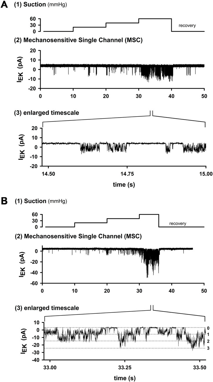 In patch-clamp experiments, inward cation currents are defined as negative currents. Opening properties of the MS channels—including voltage dependence and conductance—are comprehensively analyzed and presented in Figures 2–4, where representative single-channel traces and quantitative summaries are displayed.