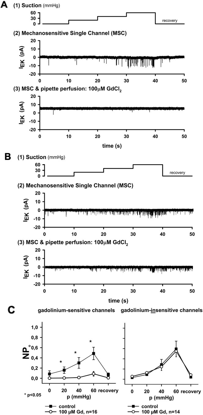 Figure 2. Gadolinium distinguishes two types of MS channels. (A) In one group of channels, activity was strongly inhibited by extracellular 100 μM Gd3+, a known blocker of MS currents. (B) In another group, channel activity was unaffected by Gd3+. (C) Summary plots of open probability (NPo) versus applied pressure. Inhibition by Gd3+ was significant in sensitive channels (n = 16, *p < 0.05) but not in insensitive channels (n = 14). Thus, two distinct channel populations could be differentiated in cardiac nodose neurons: Gd3+-sensitive and Gd3+-insensitive. Conductance analysis was only performed in the open (i.e., unblocked) state of the channel.