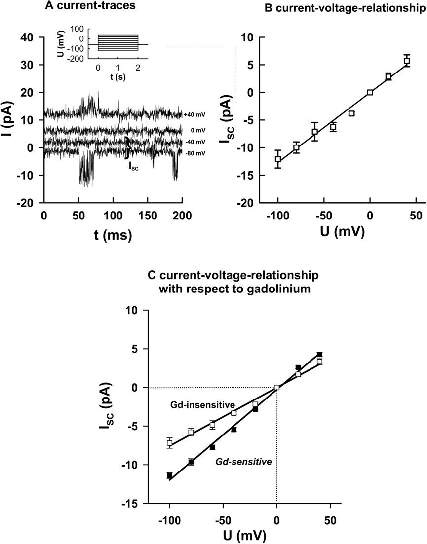 Figure 4. Lack of chloride permeability in MS channels. When extracellular chloride was replaced by sulfate, the current–voltage relationship of MS channels was unchanged. Reversal potentials remained close to 0 mV in both Gd3+-sensitive channels (n = 3) and Gd3+-insensitive channels (n = 3). This confirms that the identified MS channels conduct mainly cations and exclude Cl− as a significant permeant ion.