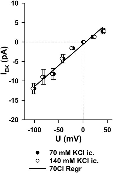 According to standard electrophysiological convention, inward cation currents (flow of positive charge into the cell) are plotted as negative currents. In our recordings, this refers to single-channel openings at negative membrane potentials. The linear I–V relationship refers to the voltage dependence of the current across a broader range, confirming the ohmic behavior of the channels without voltage gating. These observations are not contradictory but reflect the compatibility of ohmic linearity with inward currents at negative potentials, depending on the ionic driving forces.