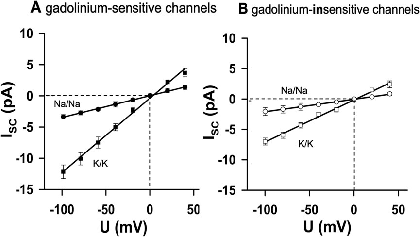 Figure 5. Sodium permeability of MS channels. Replacement of K+ with Na+ on both sides of the membrane reduced slope conductance in both channel types. (A) Gd3+-sensitive channels (n = 4). (B) Gd3+-insensitive channels (n = 4). The calculated permeability ratios of K+: Na+ were ∼3.3–3.4 in both groups (p < 0.05 between the regression slopes). Thus, cardiac nodose MS channels were predominantly K+ -selective but also allowed Na+ permeation, sufficient to depolarize neurons toward the threshold for action potential generation.