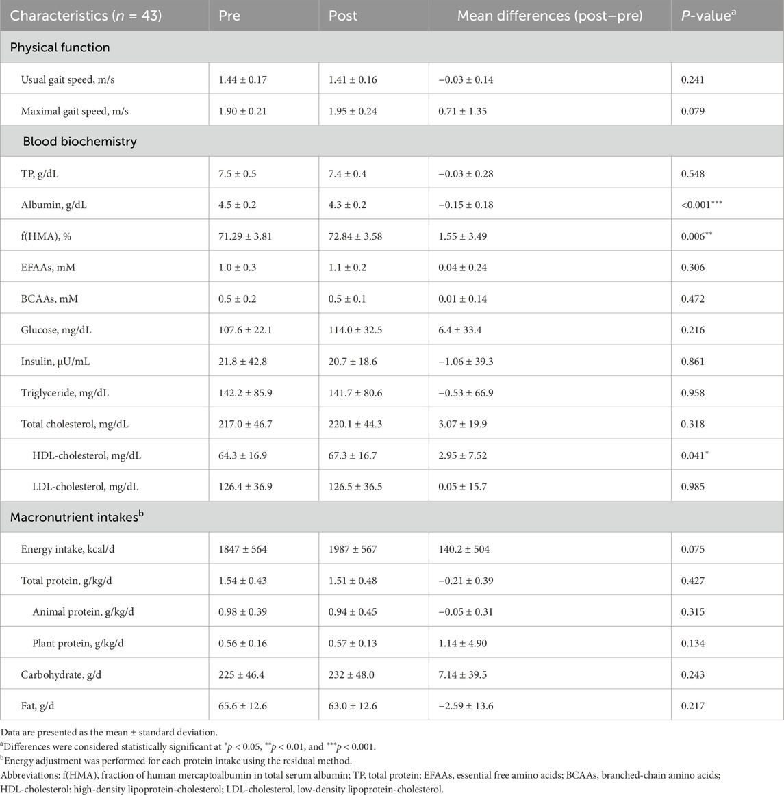 Sufficient intake of nutrients, especially dietary proteins, is necessary to maximize the effects of training (Deutz et al., 2014). Protein supplementation could overcome anabolic resistance by activating metabolism in older adults (Koopman, 2011; Tagawa et al., 2020), contributing to the synergistic effects of training on increase in muscle mass and improvement in physical function (Coelho-Júnior et al., 2022; Tagawa et al., 2022). Serum albumin concentration is a common biomarker used to assess the nutritional status of proteins. A low albumin concentration was reported to be associated with slower gait speed and malnutrition (Kobayashi et al., 2023), indicating that it may impair the effects of resistance training (Sawada et al., 2021). However, in another study, the albumin concentration showed no correlation with gait speed or protein intake (Ashikawa et al., 2020; Motokawa et al., 2024). These differences are probably due to the characteristics of the study population. Albumin concentrations decrease in older adults with severe malnutrition (Gatta et al., 2012). However, this may indicate that functional decline is undetectable in relatively healthy middle-aged and older adults. Therefore, it is now considered a predictor of morbidity and mortality in various diseases, rather than an indicator of protein nutritional status (Gatta et al., 2012). The classical blood protein nutritional parameters, including albumin levels, may not necessarily change with improvements in physical function or muscle mass, and the metabolic changes that accompany these improvements have not been fully explained.