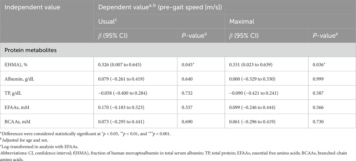 Previous studies have reported that f(HMA) is a more sensitive indicator of physical function than albumin concentration (Ashikawa et al., 2020; Ito et al., 2021). A similar relationship was observed in the present study before the intervention (β = 0.326–0.331, P = 0.045 and 0.036, respectively, Table 2). This indicates that a qualitative change occurs prior to a decrease in total concentration, as evident from the ratio of mercaptoalbumin to non-mercaptoalbumin (Ashikawa et al., 2020; Tabata et al., 2021). Therefore, f(HMA) can used to predict the decline in physical function. Notably, the association between gait speed and f(HMA) was demonstrated even in a healthy population that did not meet the gait speed criteria as per AWGS 2019 (Chen et al., 2020). This suggests that a decline in gait speed may have already begun in some individuals, even when they did not meet the criteria.
