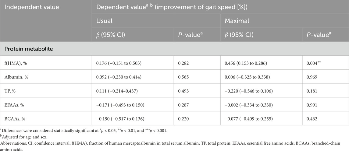 Table 3. Multivariable linear regression analysis of improvement rate of serum protein nutritional biomarkers vs. gait speed.