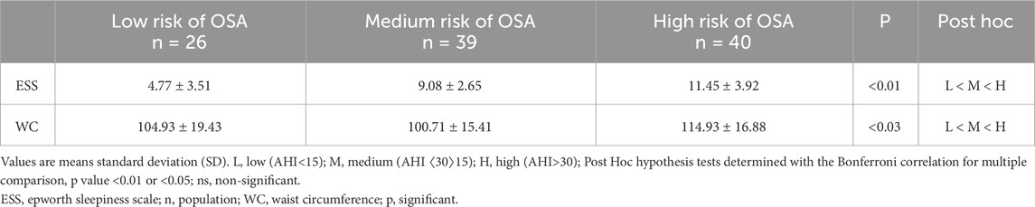 The sample size was estimated based on the main objective of the study: to assess the validity of the SPOSAP protocol as a screening tool in a population presenting symptoms compatible with obstructive sleep apnea (OSA). For this purpose, the apnea-hypopnea index (AHI) was used as the reference standard, with a classification of OSA risk (low, medium and high) based on standard clinical cut-off points. A minimum clinically relevant difference of at least three points in the Epworth Sleepiness Scale (ESS) between groups was considered, with an estimated standard deviation of 3.5 points, a confidence level of 95%, and a statistical power of 80%. Under these conditions, the minimum required sample size was estimated to be at least 30 participants per group. Ultimately, the total sample included 105 subjects (n = 26 at low risk, n = 39 at medium risk, and n = 40 at high risk of OSA), which ensured sufficient power to detect between-group differences through an ANCOVA model adjusted for age and sex.
