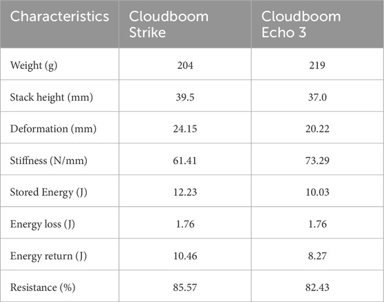 The force-displacement relationship of the AFT tested was determined by a compression test on the complete shoe (including the upper) where a custom-made structure simulating a size EU42 foot was attached to a material testing machine that measures force and displacement (Zwick/Roell, Ulm-Einsingen, Germany) (Figure 1). A force of 1800 N was applied at 2 Hz in the forefoot during 60 cycles, and the average of the last 10 cycles was used to characterize both AFTs. Longitudinal bending stiffness was calculated as the slope between 0 and 1500 N and energy return as the area of hysteresis loop. Also, resistance was calculated as the percentage of stored mechanical energy that is returned during shoe deformation–recovery, representing the efficiency of the midsole in minimizing energy loss and maximizing energy return.