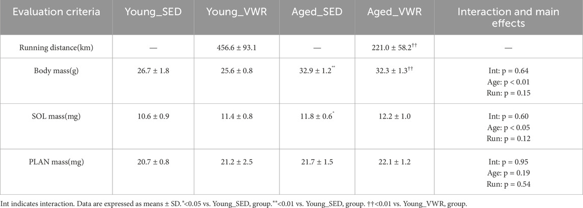 The SOL mass was not significantly affected by VWR (p = 0.60). However, a significant main effect of age was detected (p < 0.05), with Aged_SED (11.8 ± 0.6 mg) and Aged_VWR (12.2 ± 1.0 mg) group mice showing greater muscle mass than the respective Young group mice (Young_SED: 10.6 ± 0.9 mg; Young_VWR: 11.4 ± 0.8 mg). For the PLAN mass, no significant interaction (p = 0.95) or main effect of Age (p = 0.19) and Run (p = 0.54) was detected. The values remained relatively comparable across the groups. Additionally, the mass of each muscle was normalized to the body weight (Supplementary Table S4).