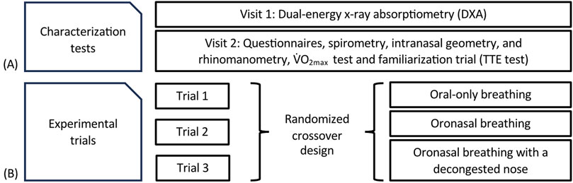Figure 1. Flowchart of the study design and schematic of (A) the characterization tests; and (B) the experimental exercise trials. TTE; Time to exhaustion.