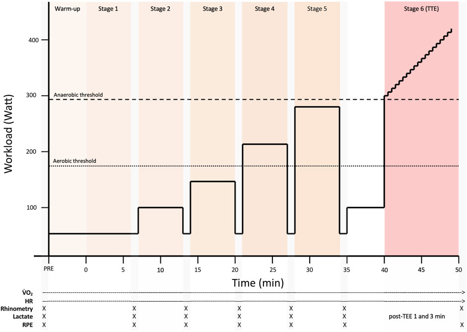 The experimental trial protocol is illustrated in Figure 2. Each test consisted of five 6-min submaximal, steady-state exercise stages followed by a sixth stage–an incremental maximal performance test to exhaustion.