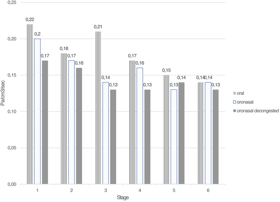 Figure 3. Mean nasal airway resistance (in Pa/cm3/sec) for the 6 test stages during oral-only, oronasal and oronasal decongested breathing.