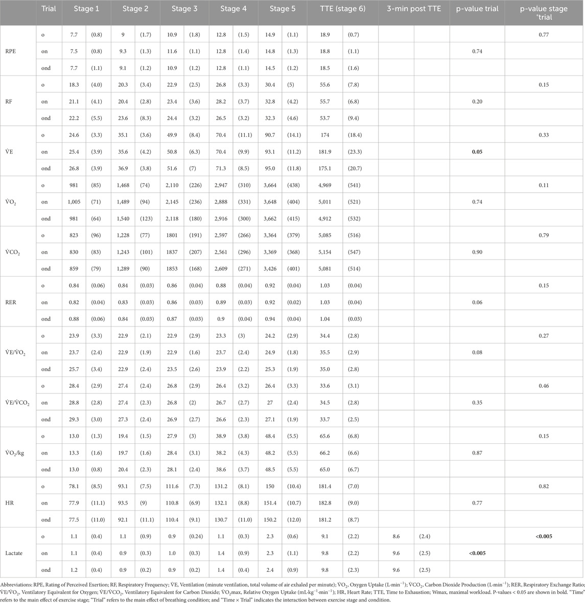 Table 1. Cardiopulmonary, perceptual, metabolic, and performance responses across six incremental exercise stages and at 3 min post–time to exhaustion (TTE) in well-trained endurance athletes (N = 12), assessed under three experimental conditions: oral-only breathing (o), oronasal breathing (on), and oronasal breathing with a decongested nose (ond). Data are presented as mean (SD).