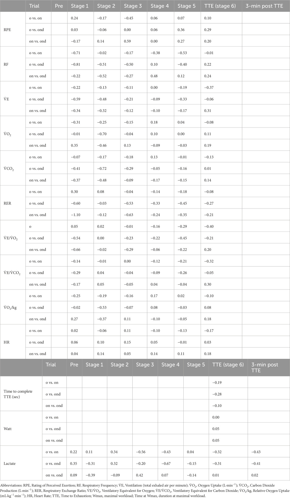 Table 2. Effect size estimates (Cohen’s d) for cardiopulmonary, perceptual, metabolic, and performance responses across six incremental exercise stages and at 3 min post time to exhaustion (TTE) in 12 well-trained endurance athletes (N = 12) under three experimental conditions: oral-only breathing (o), oronasal breathing (on), and oronasal breathing with a decongested nose (ond).