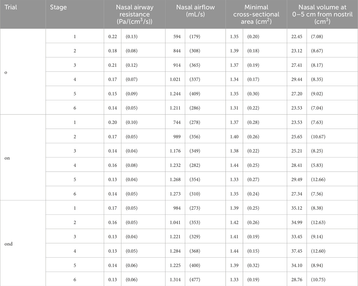 Table 3. Mean nasal airway resistance and mean nasal airflow, mean minimal cross-sectional area and mean nasal volume at 0–5 cm from the nostril at the 6 stages during: oral-only breathing (o), oronasal breathing (on) and oronasal breathing with a decongested nose (ond). Data are presented as mean (SD).