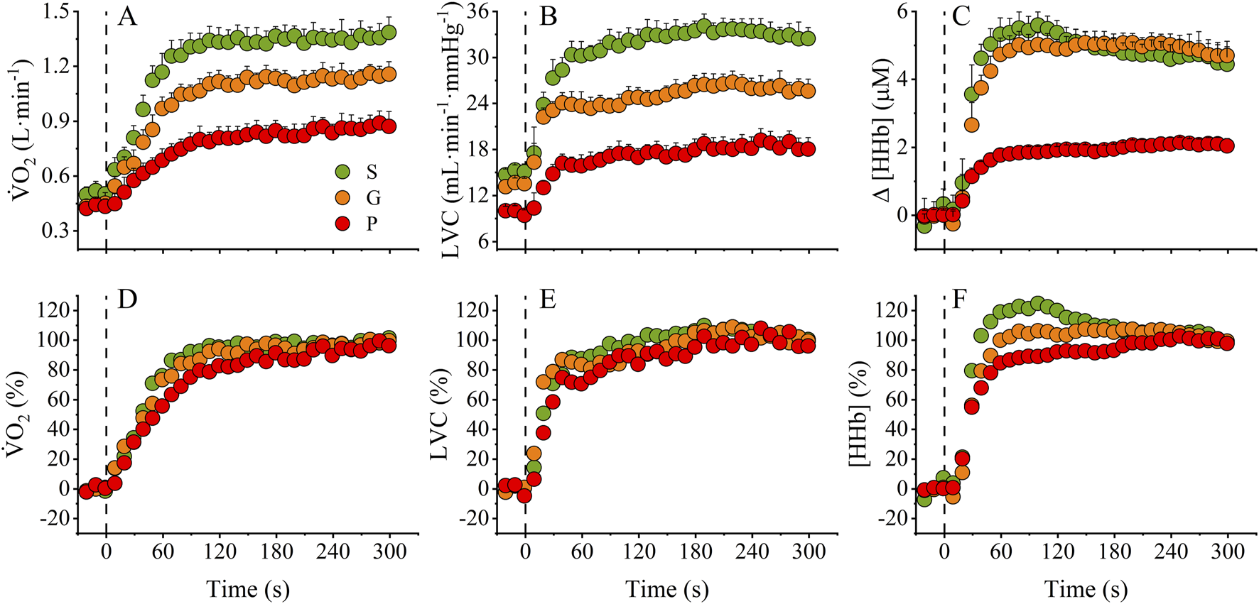 ![Six-panel graph showing physiological data over time. Panel A depicts V̇O₂ in liters per minute, Panel B shows LVC in milliliters per minute per millimeter mercury, and Panel C illustrates Δ[HHb] in micromoles. Panels D, E, and F present these metrics as percentages. The data are represented by green, orange, and red dots labeled S, G, and P. The x-axis is time in seconds across all panels. Each plot shows a rise in values, leveling off towards the end. Error bars indicate variability.](https://www.frontiersin.org/files/Articles/1656980/xml-images/fphys-16-1656980-g001.webp)