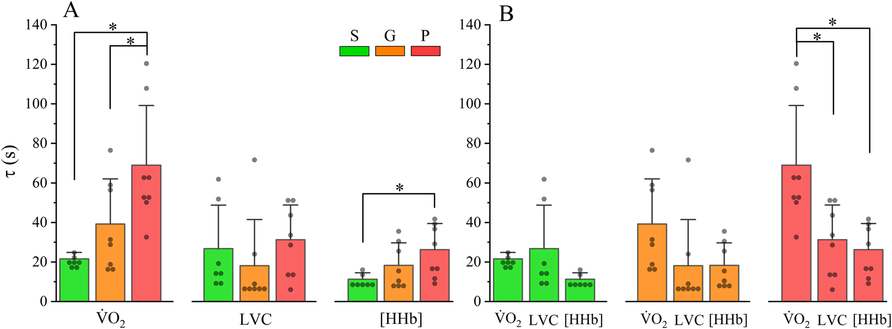 Comparison between τO2, τLVC, and τ[HHb] is depicted in Figure 2B. No within-group differences between τO2, τLVC, and τ[HHb] were observed for S and G fitness groups (p > 0.05), whereas a within-group difference in the P fitness group was detected (p < 0.05). In particular, post hoc analysis revealed that τLVC and τ[HHb] were faster (p < 0.01) than τO2 in P (p < 0.05).